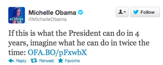 Michelle Obama took to Twitter on Sunday evening to tout her husband’s first-term achievements. Accompanying a message praising all that President Barack Obama has achieved over the past four years, she implored her followers to “imagine what he can do in twice that time.”
