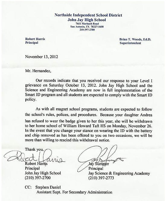 letter-from-john-jay-high-school-withdrawing-andrea-hernandez-for-not-wearing-rfid-tracking-device-id-badge